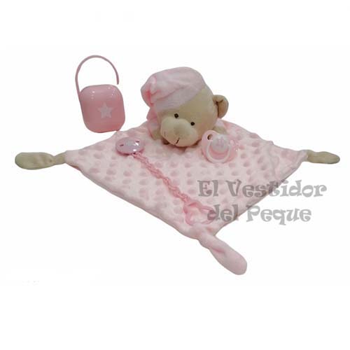 Pack 4 piezas para bebé, compuesto de doudou, chupete, cadena de estrella y caja portachupete.