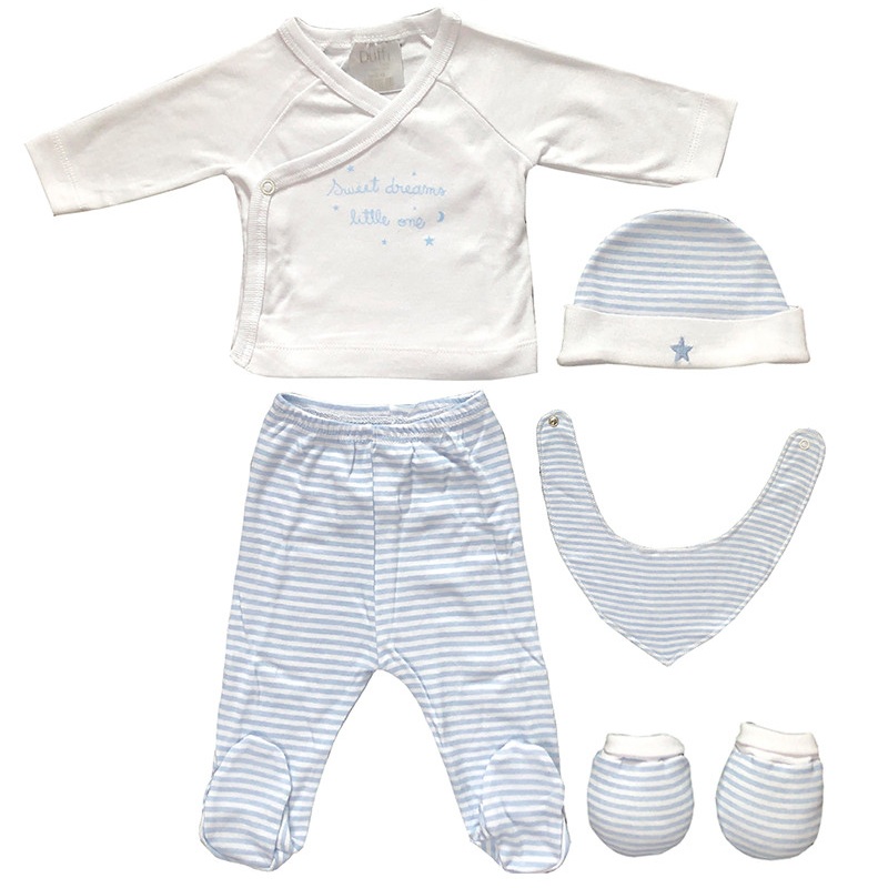 Juego de 5 Piezas para bebé, compuesto por body manga larga con apertura lateral, polaina, gorrito, manoplas y babero.