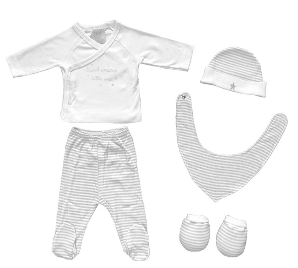 Juego de 5 Piezas para bebé, compuesto por body manga larga con apertura lateral, polaina, gorrito, manoplas y babero.