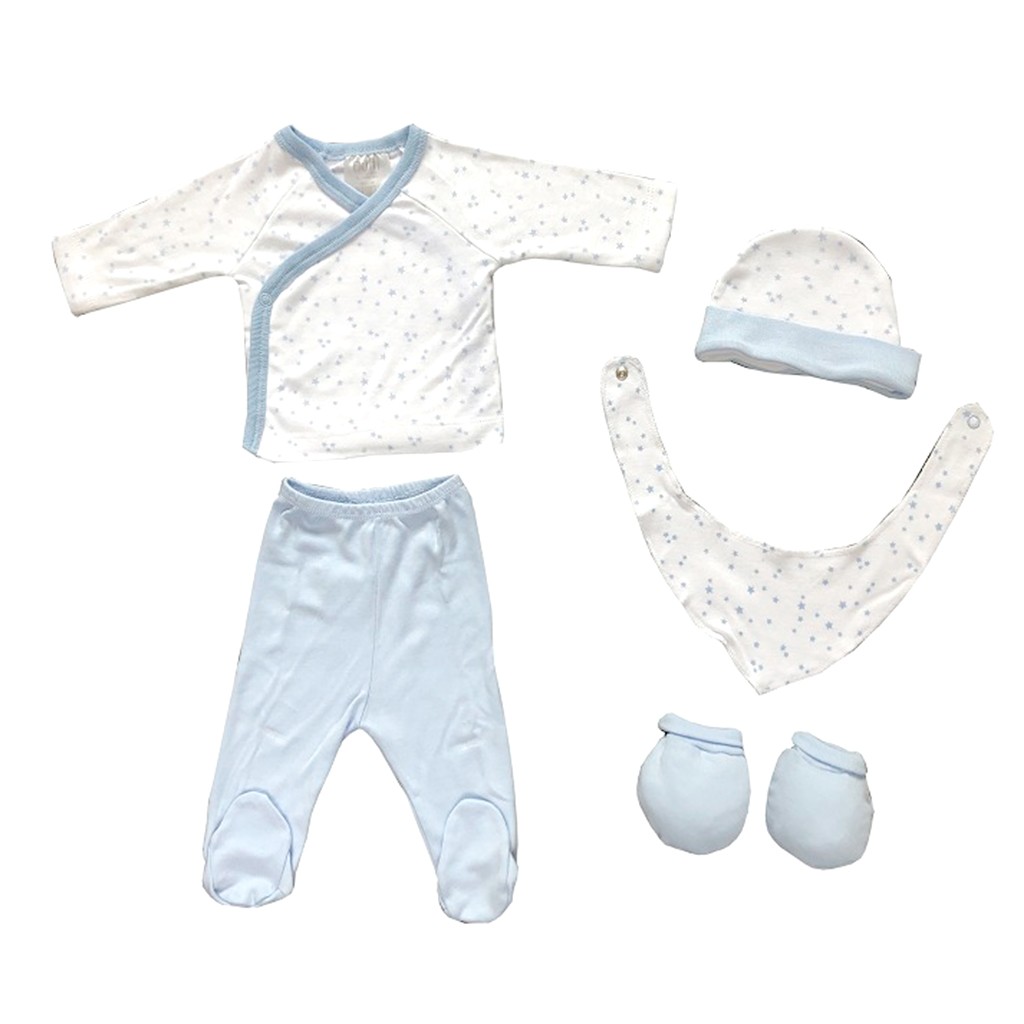 Juego de 5 Piezas para bebé, compuesto por body manga larga con apertura lateral, polaina, gorrito, manoplas y babero.