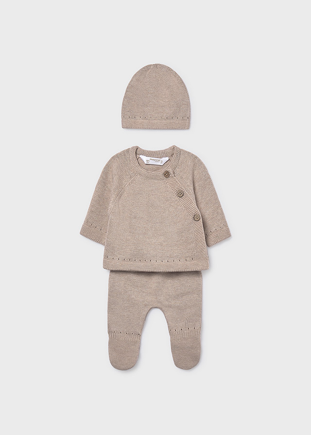 Conjunto de 3 piezas, compuesto por jersey, polaina y gorro.