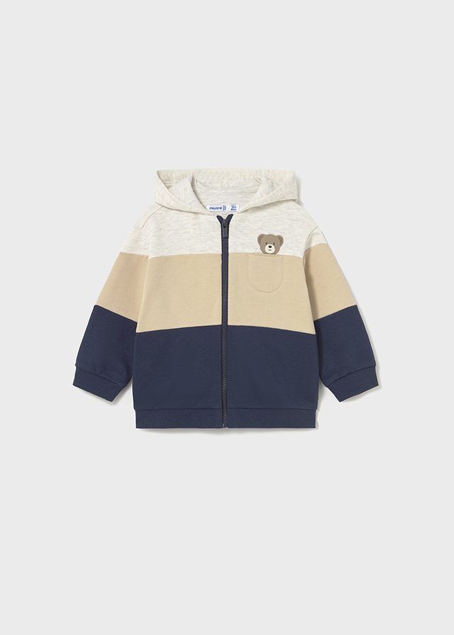 Conjunto de chándal de tres piezas para bebé. Compuesto por sudadera con capucha y dos pantalones.